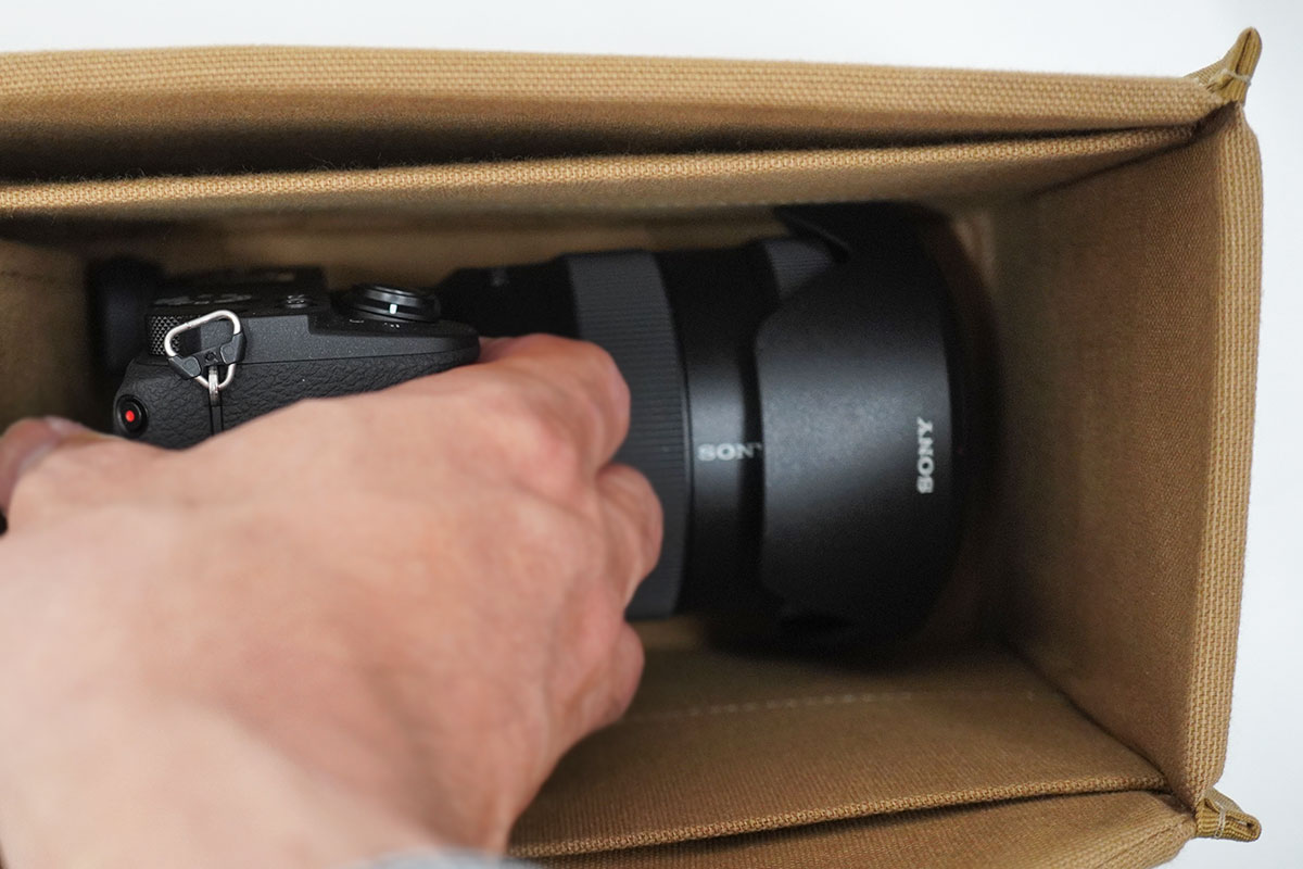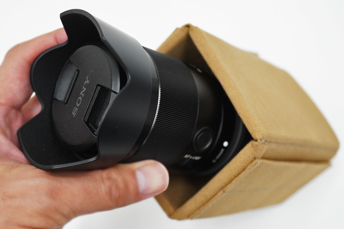 ※レンズ本体はすっぽり入る。レンズフードは若干干渉する。