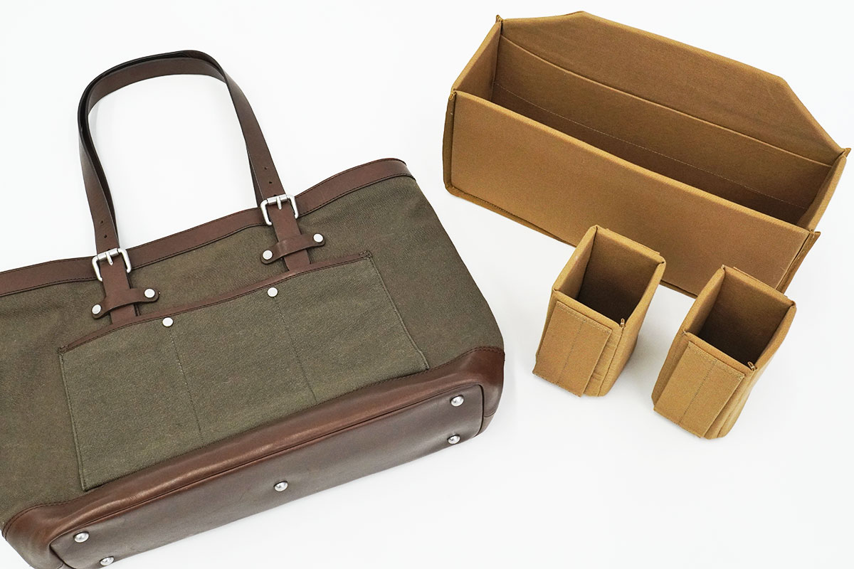 そうすると、トートバッグだけだとクタっと倒れてしまっていたものが、インナーケースが入ったことで、しっかりと自立する。