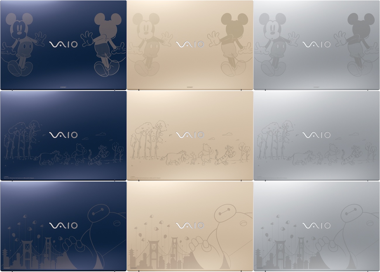 VAIO F16・F14は、本当に必要な機能を研ぎ澄ませながら、誰もが手に取りやすくて使いやすい、「日々の生活をちょっと良くする」ことを目指した“定番PC”です。この“定番PC”と、ウォルト・ディズニーがもたらす世界観を重ね合わせることで、お客様の好奇心を満たし、ひらめきと感動を体験することができるきっかけとなりたい。そして、ディズニーキャラクターのように、より多くの方に愛着を持って長く使っていただける製品でありたいという想いから、このディズニーモデルが実現しました。ディズニーの象徴として人気の高い「ミッキーマウス」、来年100周年を迎え、愛され続けている「くまのプーさん」、“主人公の相棒”として、諦めない勇気を与えてくれる「ベイマックス」をフィーチャーしたデザインが採用されています。