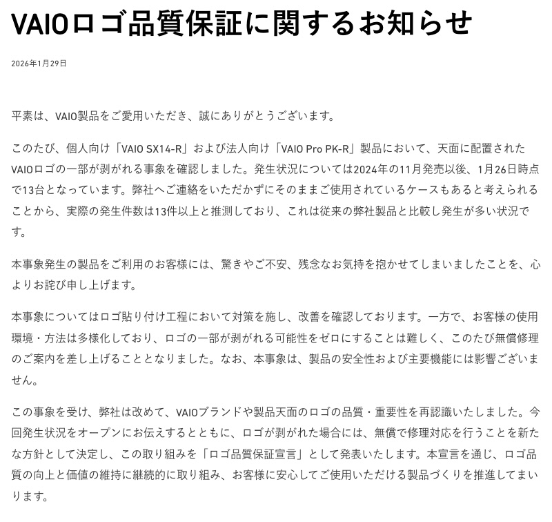 VAIO㈱は、2026年1月29日に「VAIOロゴ品質保証に関するお知らせ」を発表した。