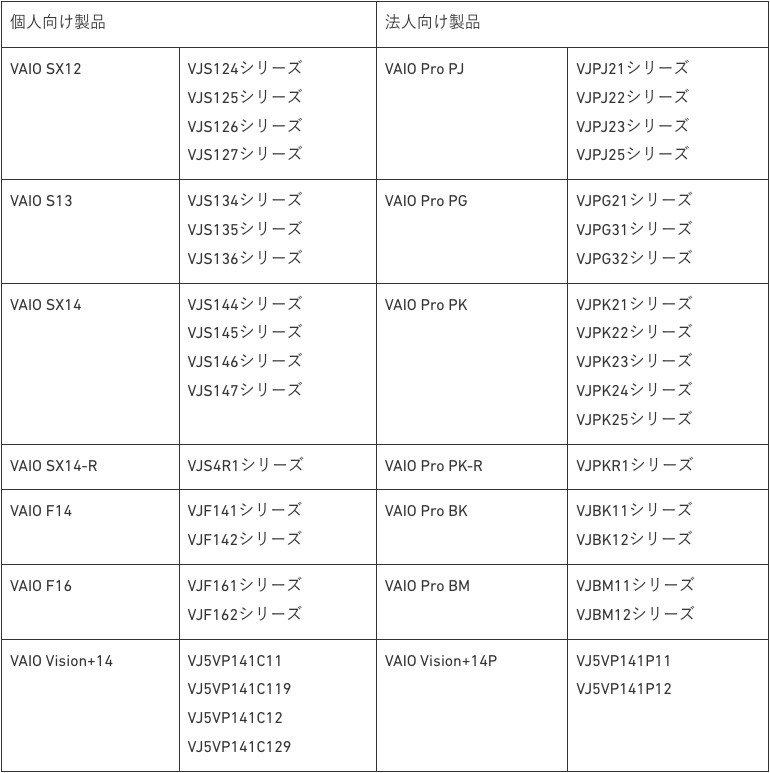 個人向け製品 :VAIO® SX12・S13・SX14・SX14-R・F14・F16、VAIO® Vision+14