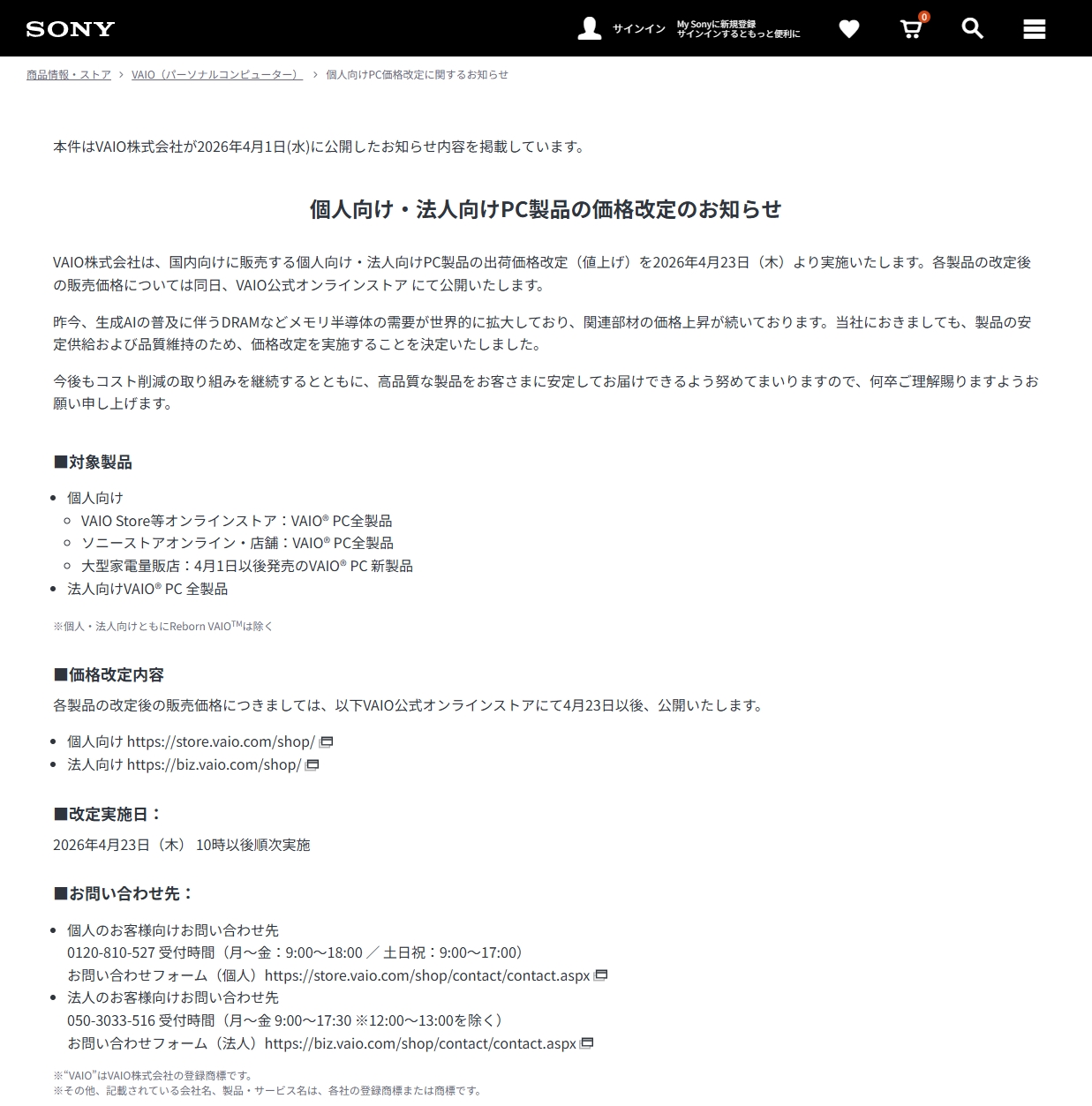 VAIOやノジマなどでの販売だけでなく、ソニーストアで販売されるVAIO® PCについても、2026年4月23日(木)10時以後順次値上げが実施される。
