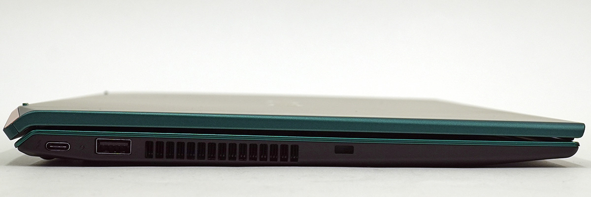 本体左側にUSB type-C端子、USB type-A端子(と、セキュリティロック・スロット)を配置している。