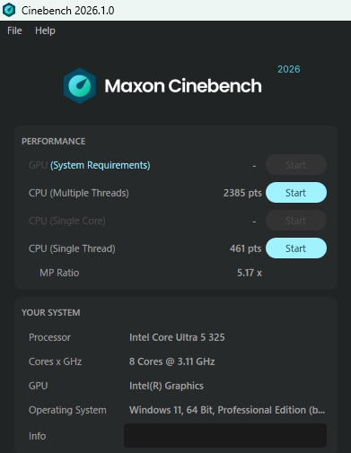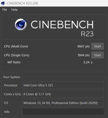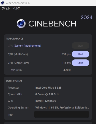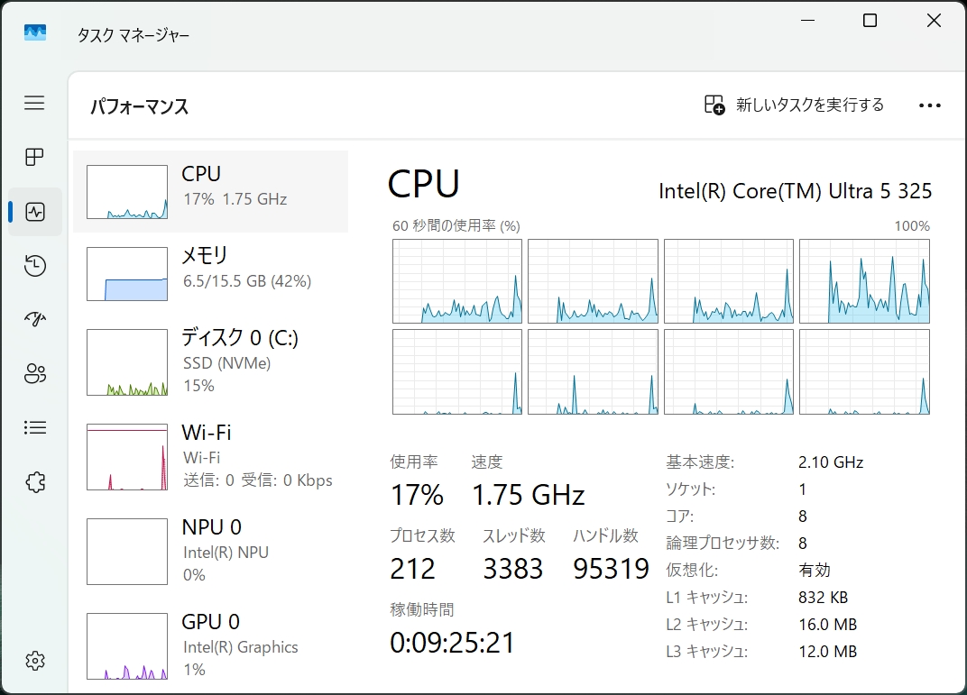 Core Ultra 5 325(P:4コア、LP Eコア:4/8スレッド)(P:2.3GHz、LPE:1.7GHz) / 最大P:4.7GHz、LPE:3.5GHz)