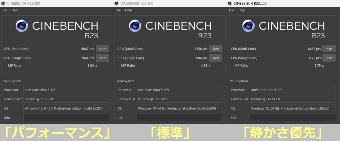 次にVAIOの設定アプリから選択できる、CPUとファンの動作モード「パフォーマンス優先」、「標準」、「静かさ優先」を変えてテスト。