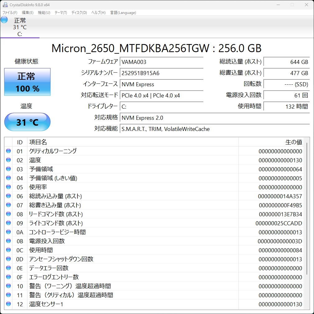 レビュー機のVAIO SX14-R(2026年モデル)に搭載されているSSDは第四世代 スタンダードSSD(NVMe)のため、実際の製品はこれよりも遥かに高速な読み込みと書き込みとなる。