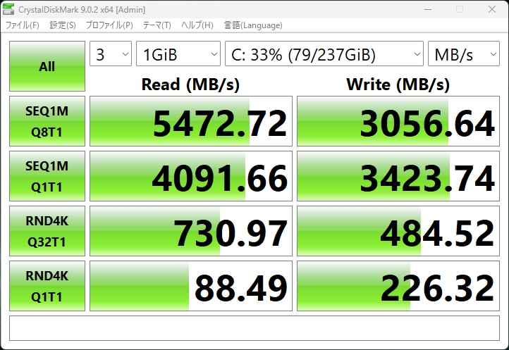 ストレージ性能を「CrystalDiskMark 9.0.2」で計測。