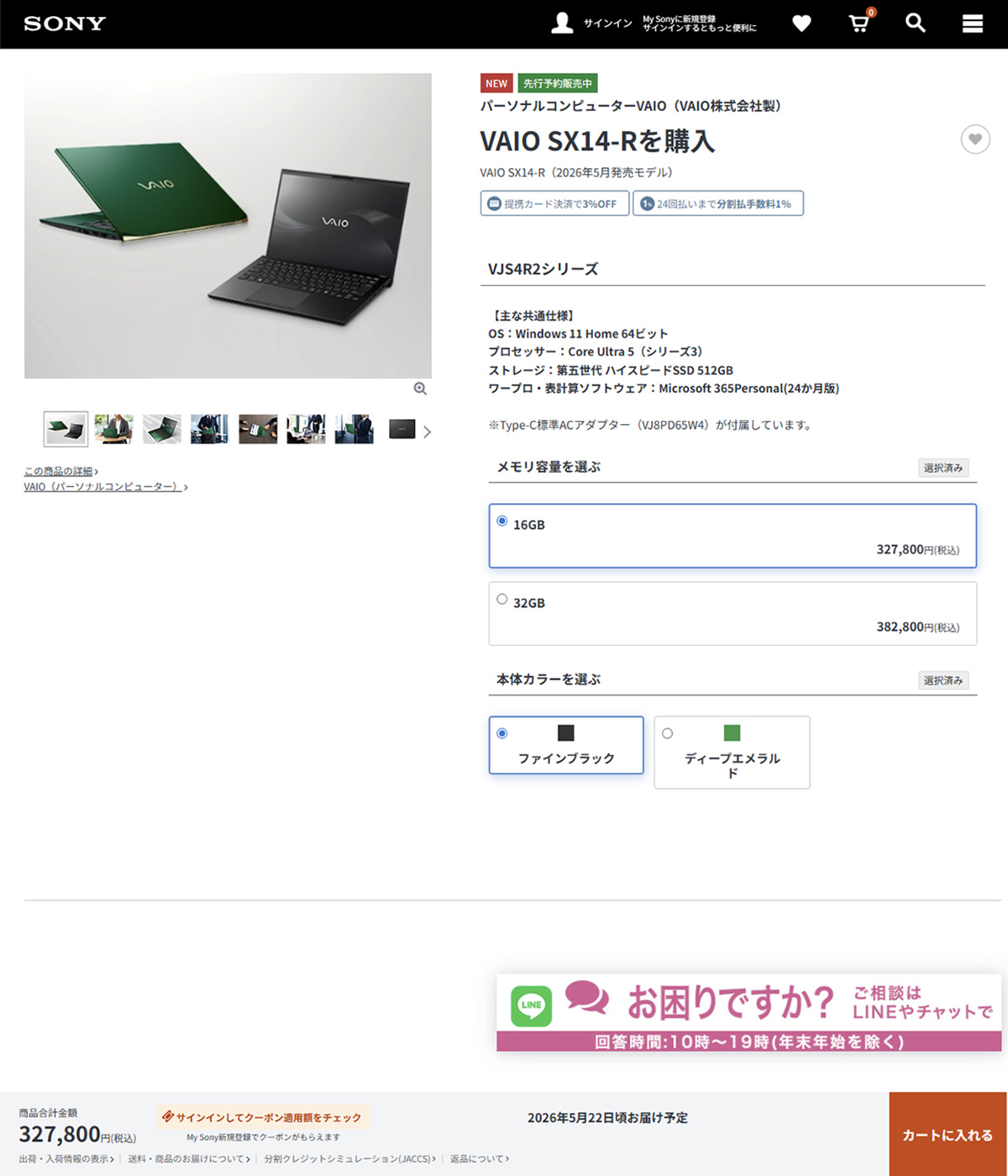 ソニーストアで販売されているモデルの構成は、CPUはCore Ultra 5-325、SSDは512GB、さらにMicrosoft 365Personal(24か月版)を付属して、販売価格327,800円(税込)。