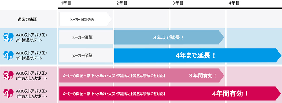 延長サポートは通常の保証の延長バージョン、あんしんサポートは落下破損や火災、水こぼし等の偶然な事故にも対応。