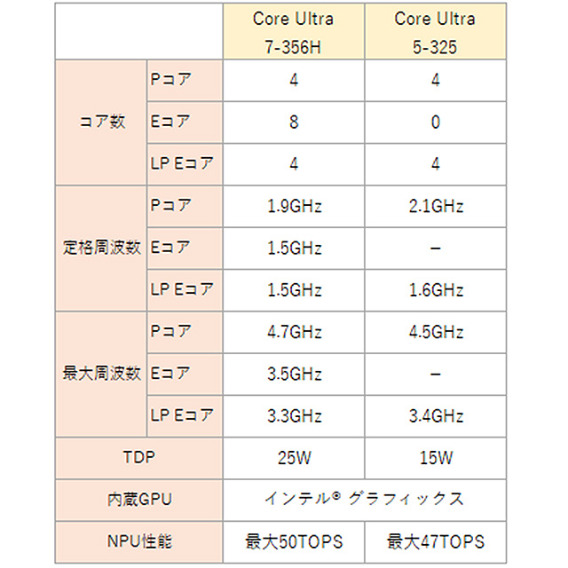 Core Ultra 5(シリーズ3) 325、 メモリー16GB、スタンダードSSD 256GB