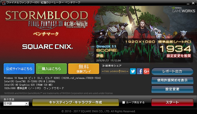 スクウェア・エニックスのFINAL FANTASY XIVの動作環境を診断するためのベンチマークソフトテスト。グラフィックスAPIがDirectX11のみになっている。