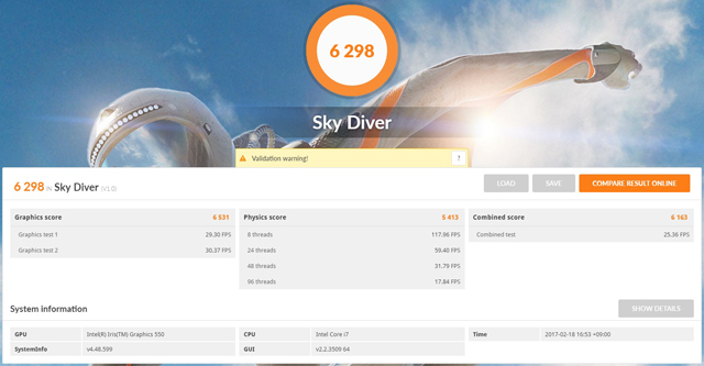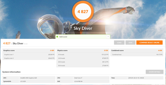 解像度1920×1080、DirectX 11を使用したハードルが高くゲーミングノートやミドルGPUクラスを搭載するデスクトップPC向けのテスト「Sky Diver」となると、GPU内蔵CPUのPCとしては条件は厳しくなってくる。