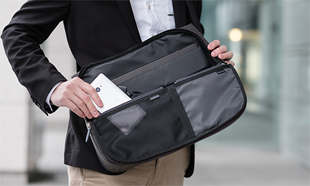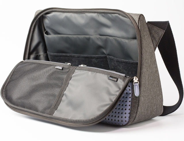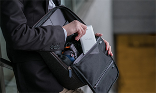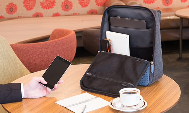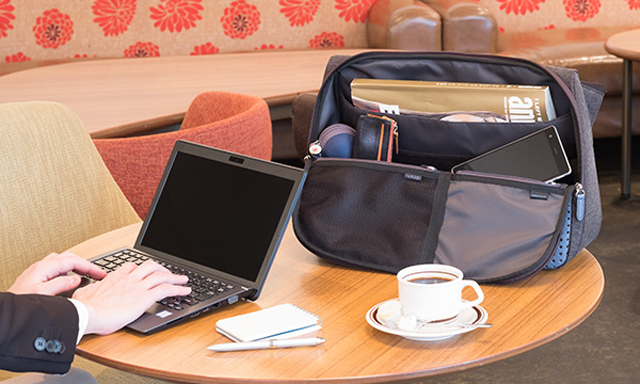 デスクの一番上の引き出しを開いたまま作業する感覚で、公園のベンチやオフィスなど、鞄の底の方まで見やすく、使いたいツールにすぐにアクセスできる機動性が特徴。