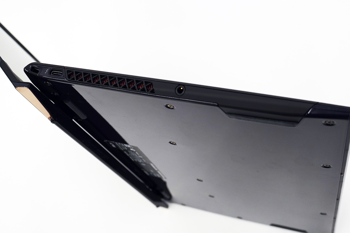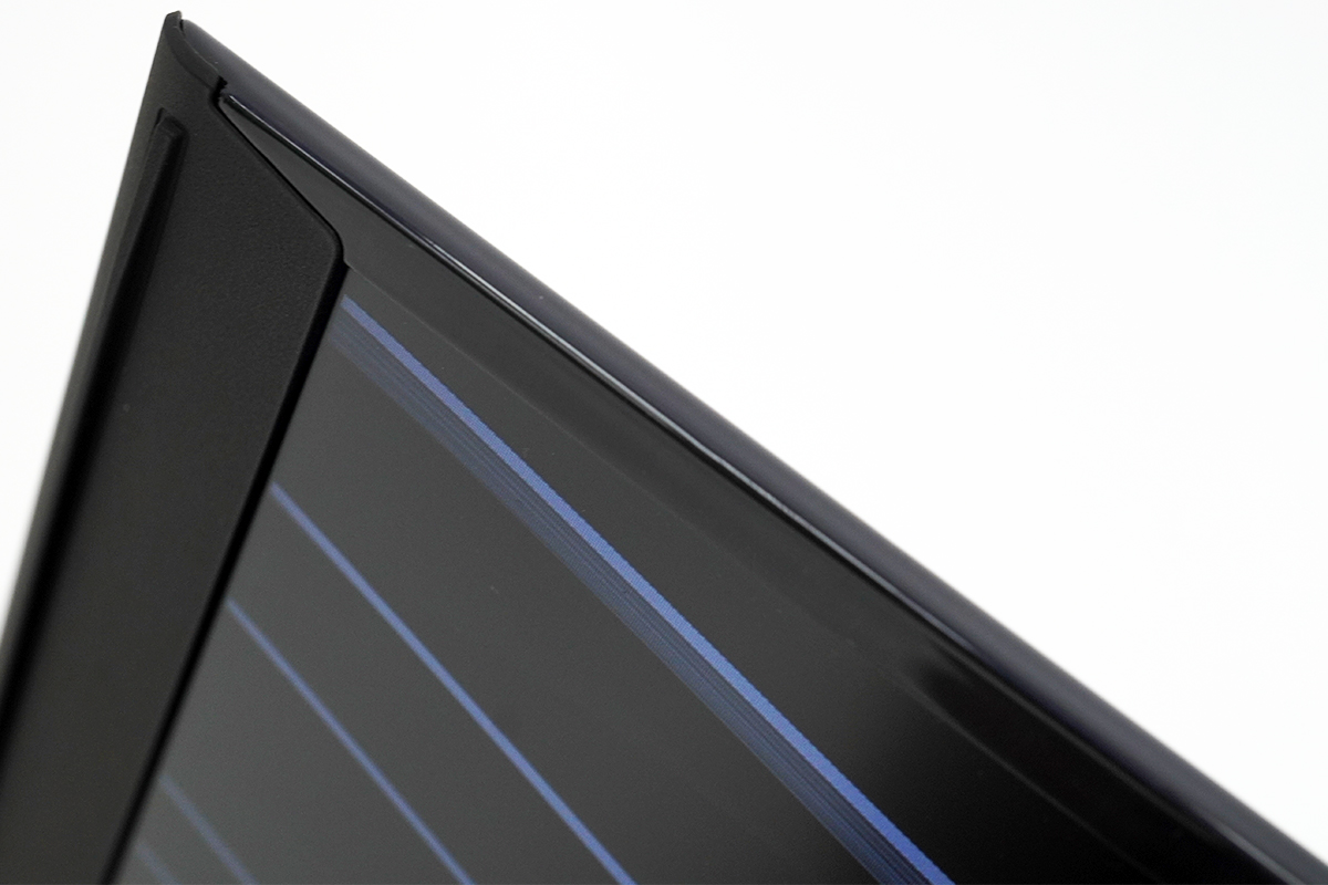 サイドのベゼル部は、カーボンファイバーが天板からつながってコの字状に折り曲げられている。