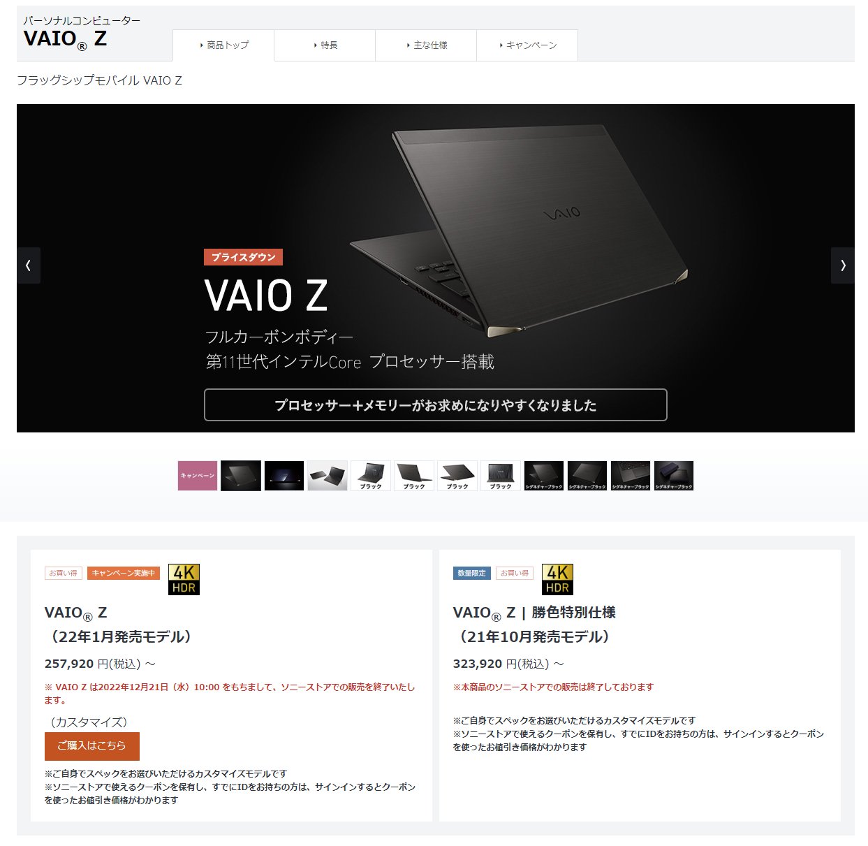 2022年発売モデルの「VAIO Z」について、2022年12月21日(水)10時に、ソニーストアでの販売を終了することを告知。