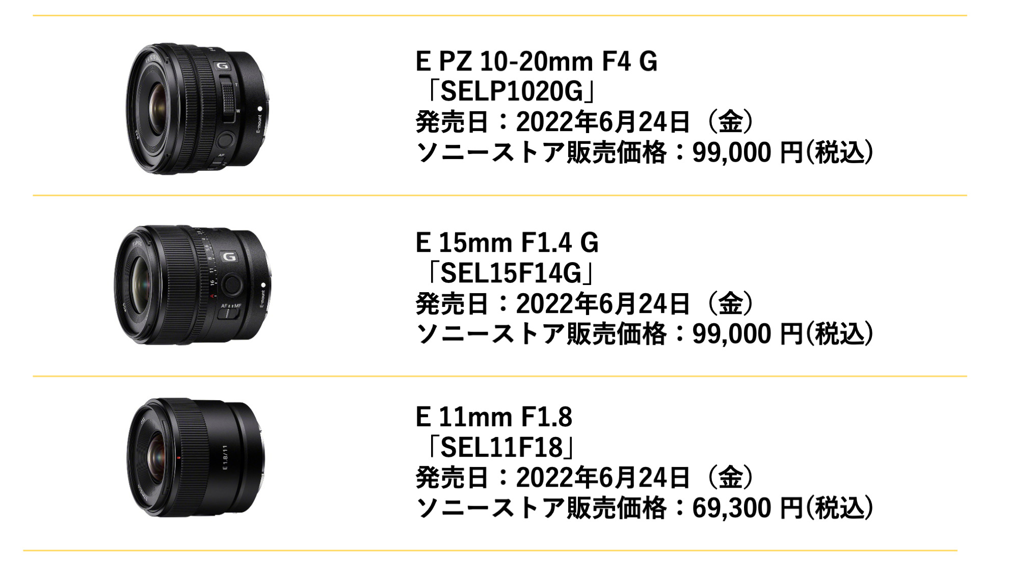 ソニーは、Eマウントレンズとして、世界最小・最軽量の超広角パワーズームのGレンズ「E PZ 10-20mm F4 G(SELP1020G)」、大口径広角単焦点のGレンズ「E 15mm F1.4 G(SEL15F14G)」および超広角単焦点レンズ「E 11mm F1.8(SEL11F18)」の計3本のAPS-C対応レンズ。