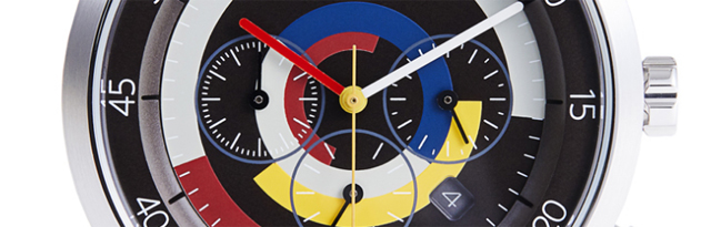 高い精度で噛み合った歯車を色の重なりで表現、長針・短針・秒針には遊び心をプラスしながら暗い場所での文字盤の見えづらさも解消。