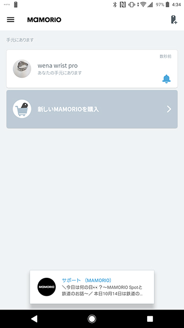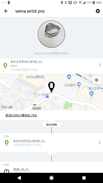 「wena wrist pro」や「wena wrist active」を腕に身に着けていて、スマホを確認するときは、当然アプリ上では、「あなたの手元にあります。」と表示。