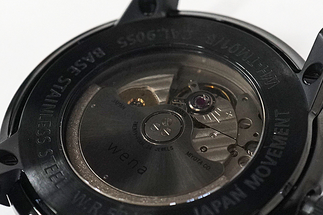 キャリバーは、高品質な機械式ムーブメント「90S5」。錘にwenaロゴを刻印。