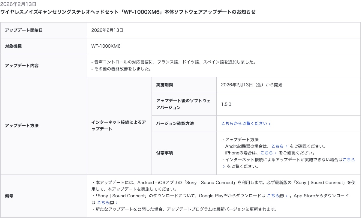 ソニーフラグシップ完全ワイヤレスイヤホン「WF-1000XM6」が発表初日に本体ソフトウェアアップデート配信(Ver.1.5.0)。言語追加やその他機能改善を実施。