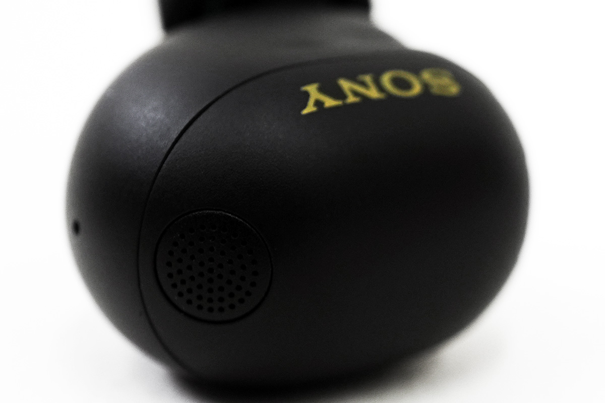 WF-1000XM6」のブラックを見ると、全体は黒く覆われていて、唯一SONYのロゴのみゴールドで刻印されている。