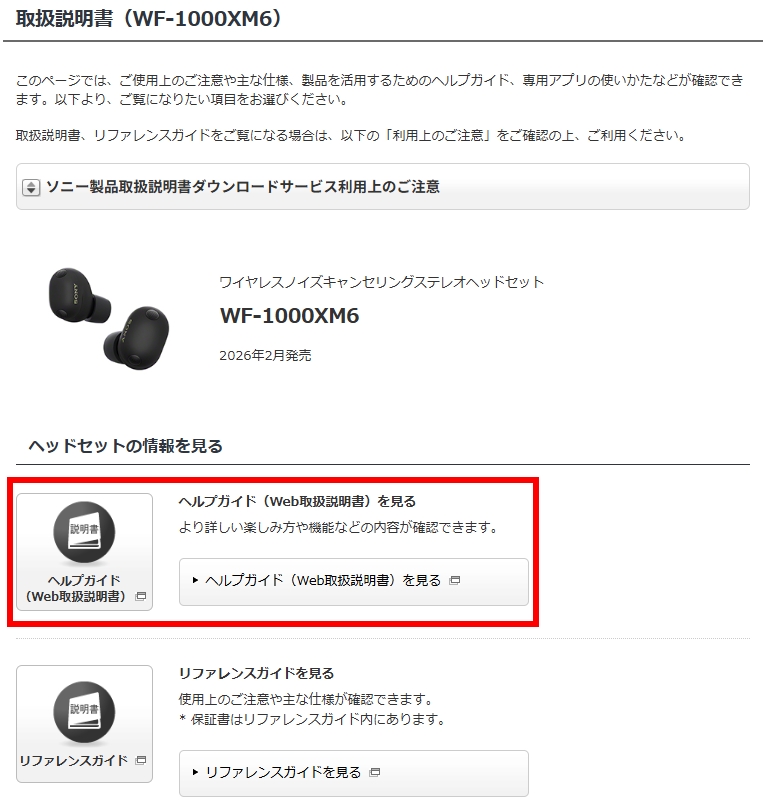 「取扱説明書」のページには、「ヘルプガイド(Web取扱説明書)」とイヤホンに同梱される「リファレンスガイド」を確認することができる。