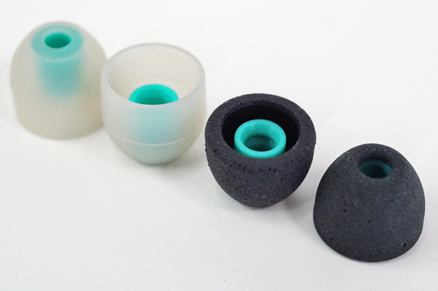2種類の硬度のシリコンゴムに独自開発のシリコンフォーム素材を組み合わせた「トリプルコンフォートイヤーピース」が S/M/Lの3種類付属している。