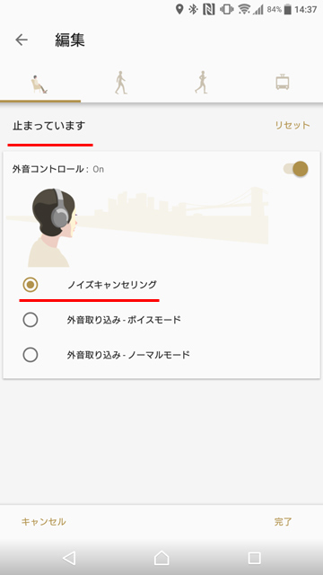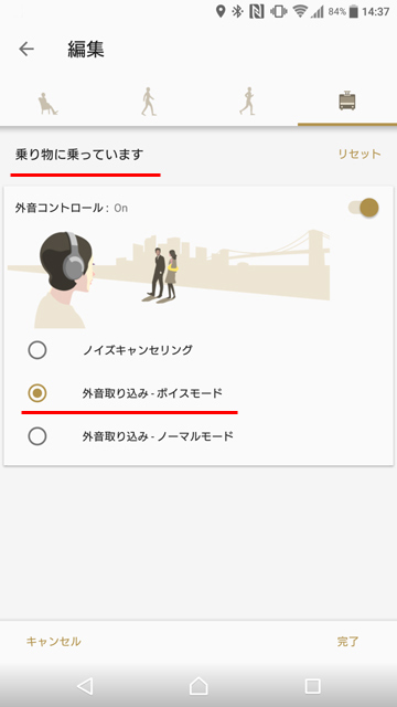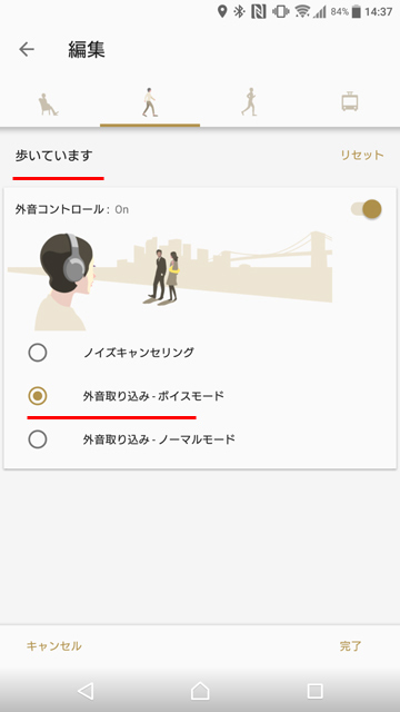 例えば上画像の場合であれば、止まっているときは「ノイズキャンセリング」になり、歩くと「外音取り込み(ボイスモード)」、走ると「外音取り込み(ノーマルモード)」、乗り物にのっているときは「外音取り込み(ボイスモード)」に自動的に変化する。