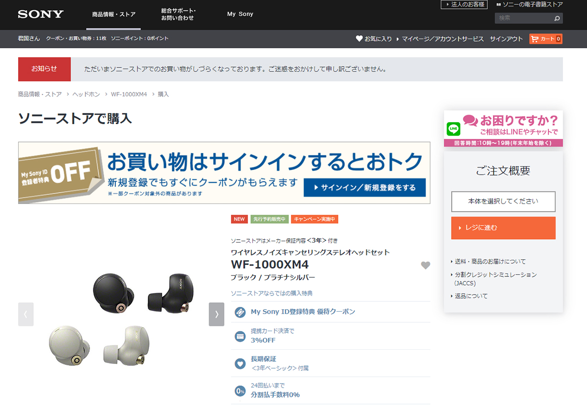 ここで、My Sony IDを登録している場合、「定期クーポン」が発行されていると、ソニーストア割引クーポン(10%OFF)が利用できる。