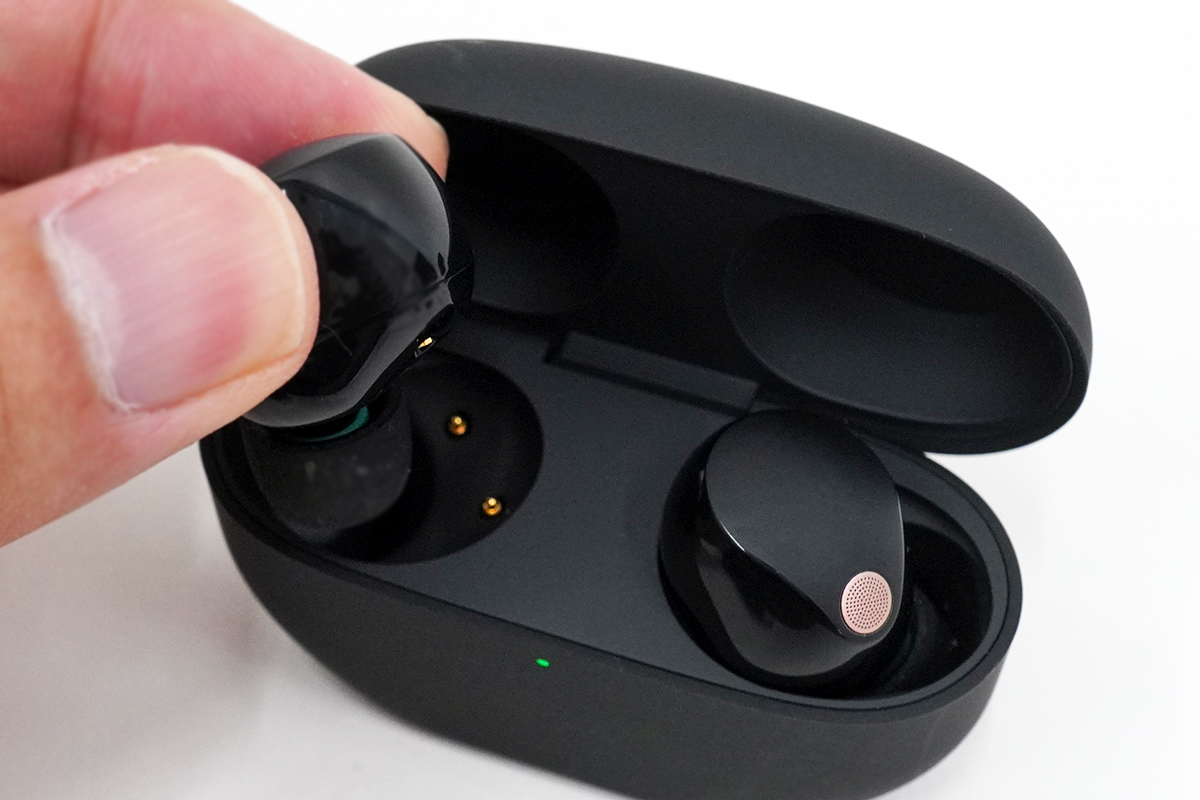 「WF-1000XM4」ではアイコニックな存在だった外部マイクは、風ノイズの低減構造を採用したことでスッキリとしたデザインになっている。