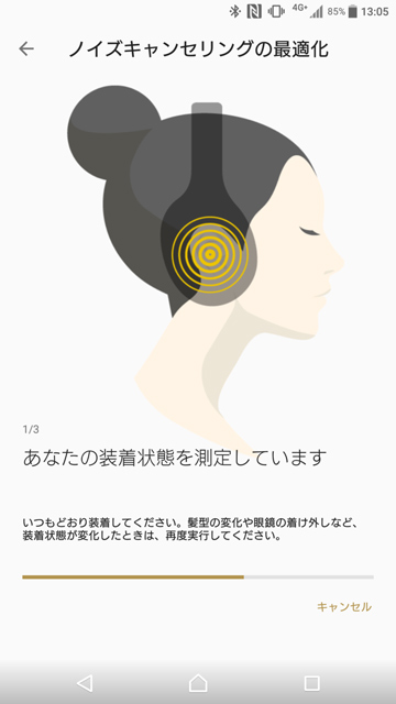 ノイズキャンセリングを最適な状態にしてくれる「パーソナルNCオプティマイザー」は、試験信号音がピーヒョロロープルップーと流れて、頭の形や髪型、メガネの有無、装着したズレといった個人差を検出してベストな状態にあわせてくれる。