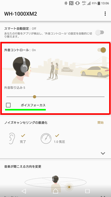 あらかじめ止まっている時/歩いている時/走っている時/乗り物に乗っている時の4パターンから、それぞれ外音取り込みのレベルとボイスフォーカスのオンオフを好みで設定しておく。