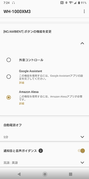 ”【NC/AMBIENT】ボタンの機能を変更”から”Amazon Alexa”へ変更できる。