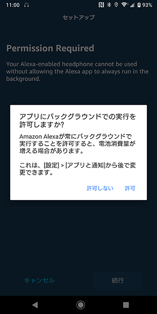 Amazon Alexaが常にバックグラウンドで動作するので電池消費量が増えるかもしれないよという注釈に許可。