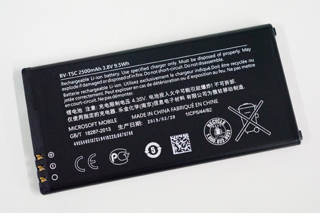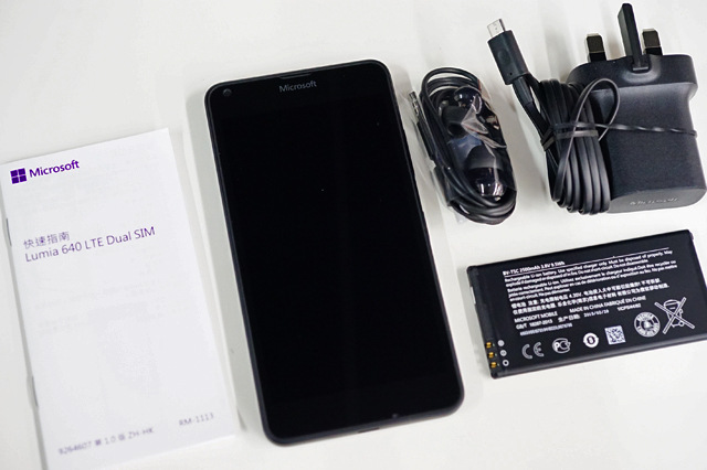 中身は、「Lumia 640」本体に、付属品として、バッテリー、microUSB端子になったACアダプター、イヤホン、それから薄い取扱説明書。かなりシンプル。