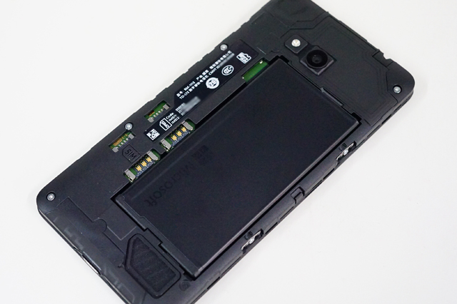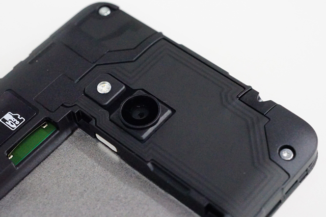 2つのSIMカードスロットもMicroSDカードスロットのどちらも、バッテリーをハメると取り出せなくなる場所にあるので、電源を入れたままでの抜き差しは出来ないようになっている。スピーカーはモノラルで、メインカメラは、8メガピクセルで、LEDのFlash付き。