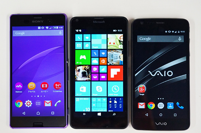 上記画像は、「Xperia Z3」、「Lumia 640」、「VAIO Phone」を正面から比較してみたもの。同じディスプレイサイズの「VAIO Phone」とほぼ同等サイズ。「Xperia Z3」は5.2インチディスプレイなので少し大きいけれど極端に薄いのとやっぱり質感が全然違う。