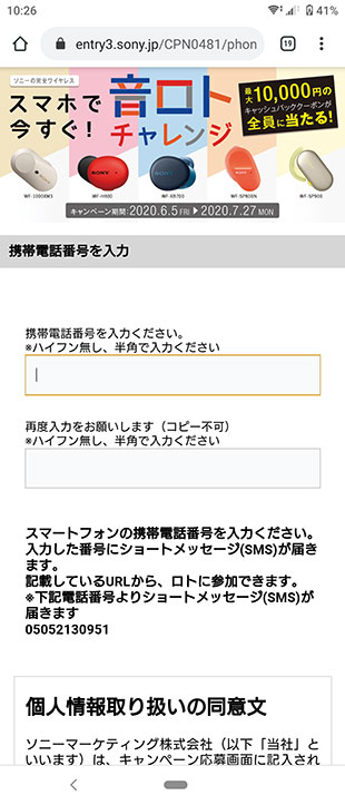 自身のいつも使っているスマートフォン(電話番号のあるSIMカードがささっていること)を用意して、「スマホで今すぐ音ロトチャレンジ」へアクセスする。