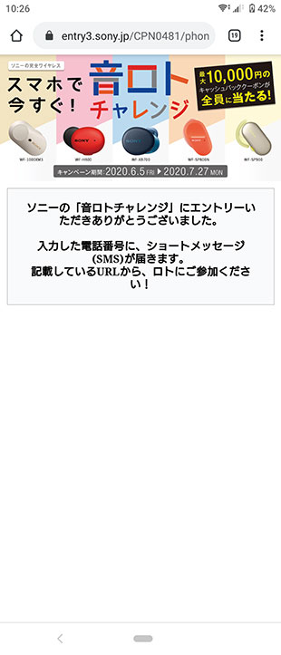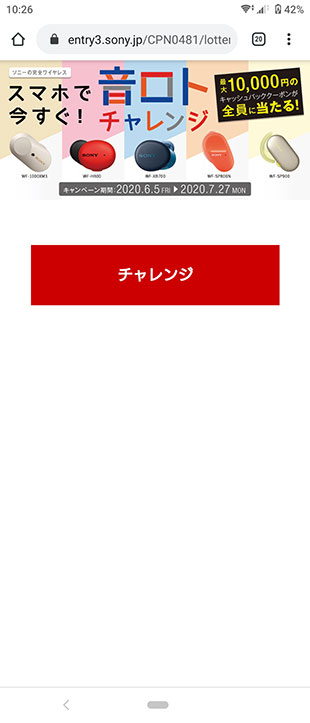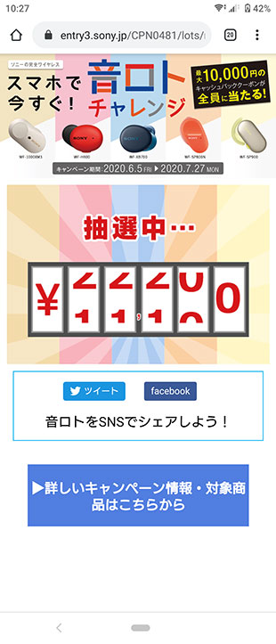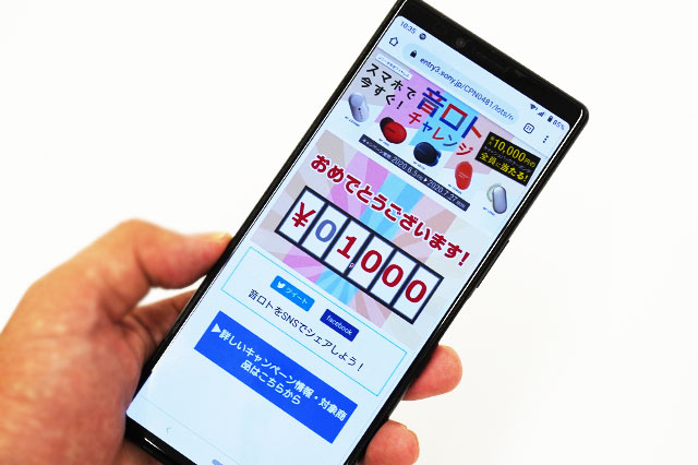 ソニーの完全ワイヤレスヘッドセットを買う前に必ずチャレンジしてみよう。1万円/5千円/2千円/千円/5百円 のどれかが当たる「スマホで今すぐ音ロトチャレンジ」。