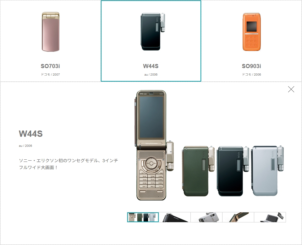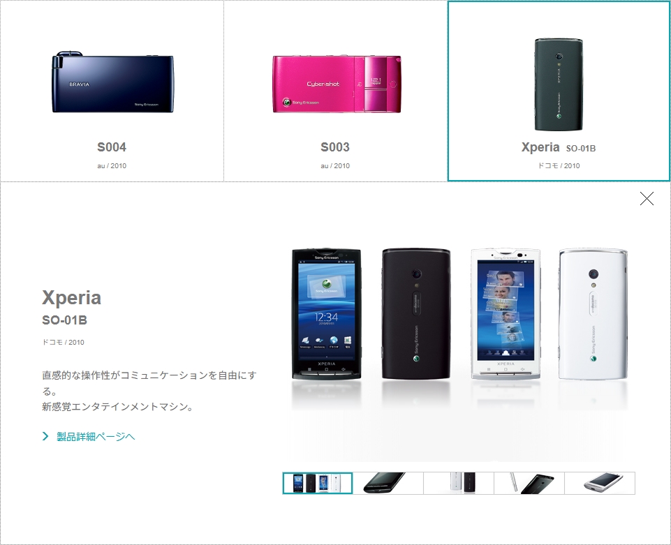 ミュージアムサイトでは、Xperiaだけでなくソニーエリクソン時代のフィーチャーフォンなども掲載されている。