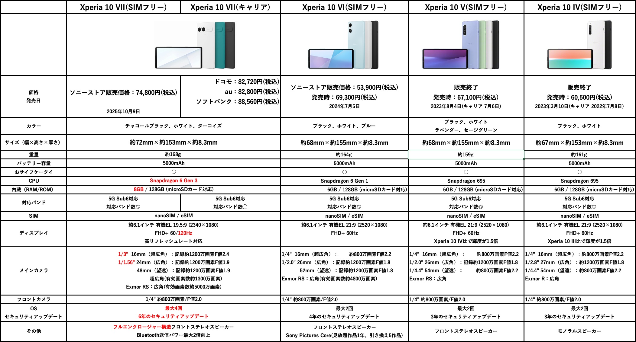 上の表は、「Xperia 10 VII」SIMフリーモデル/キャリアモデル、そしてSIMフリーモデルの「Xperia 10 VI、Xperia 10 V、Xperia 10 IV」を比較したもの。