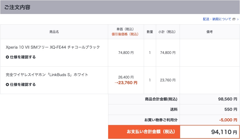 Xperia 10 VIIとLinkBuds Sをまとめて購入すると、合計金額が101,200円となるため、お買い物券5000円が利用できるという事になる。