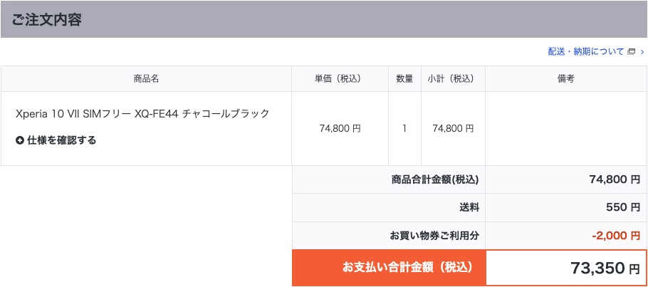 Xperia 10 VII(XQ-FE44)を単体購入すると総額は74,800円(税込)。