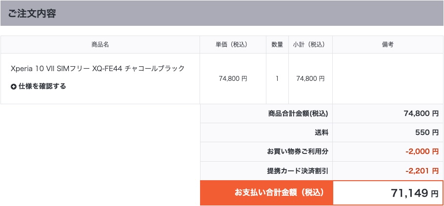 ここで、支払い方法にソニー提携カード決済で3%OFF利用すると最終的な支払金額は71,149円となる。