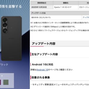 ソフトバンク Xperia 10 VII A502SO が、Android 16へのOSバージョンアップを開始。au配信済み、ドコモ、SIMフリーモデルについてもアップデート予定。
