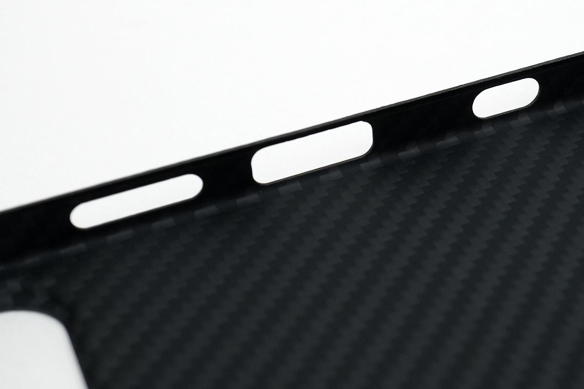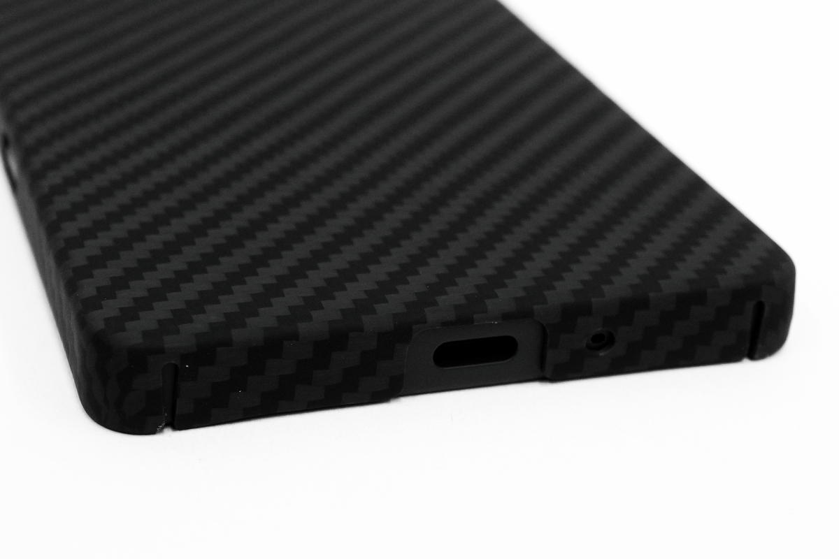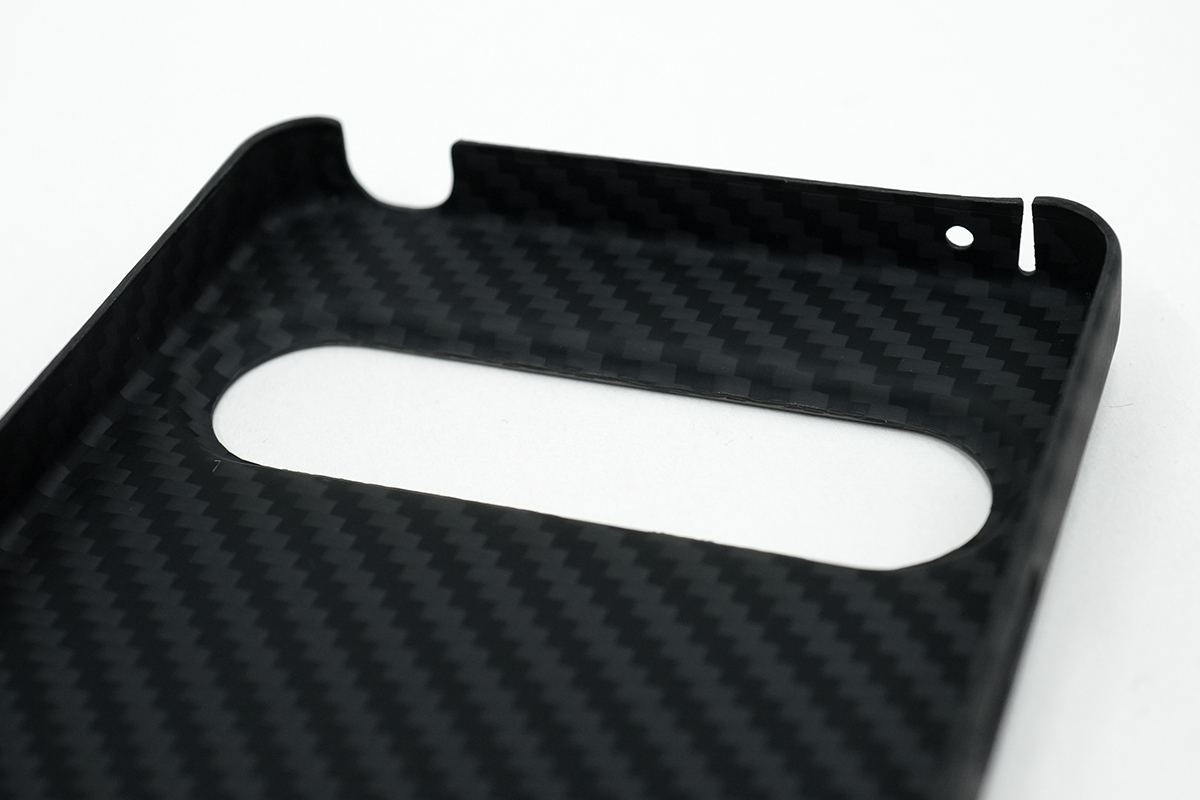 外周全体をしっかりとカバーしつつ、ボタンの操作性やUSB-Cコネクターの脱着を考慮して調整されたカットライン。滑りづらくサラリとした肌触りに汚れの付きにくい表面処理など、長きにわたりアラミド繊維でケースを作り続けてきたディーフのノウハウが詰まっています。もちろん、4G, 5Gを含むデータ通信、通話、NFC通信、モバイルSuicaなど使用上の影響はありません。