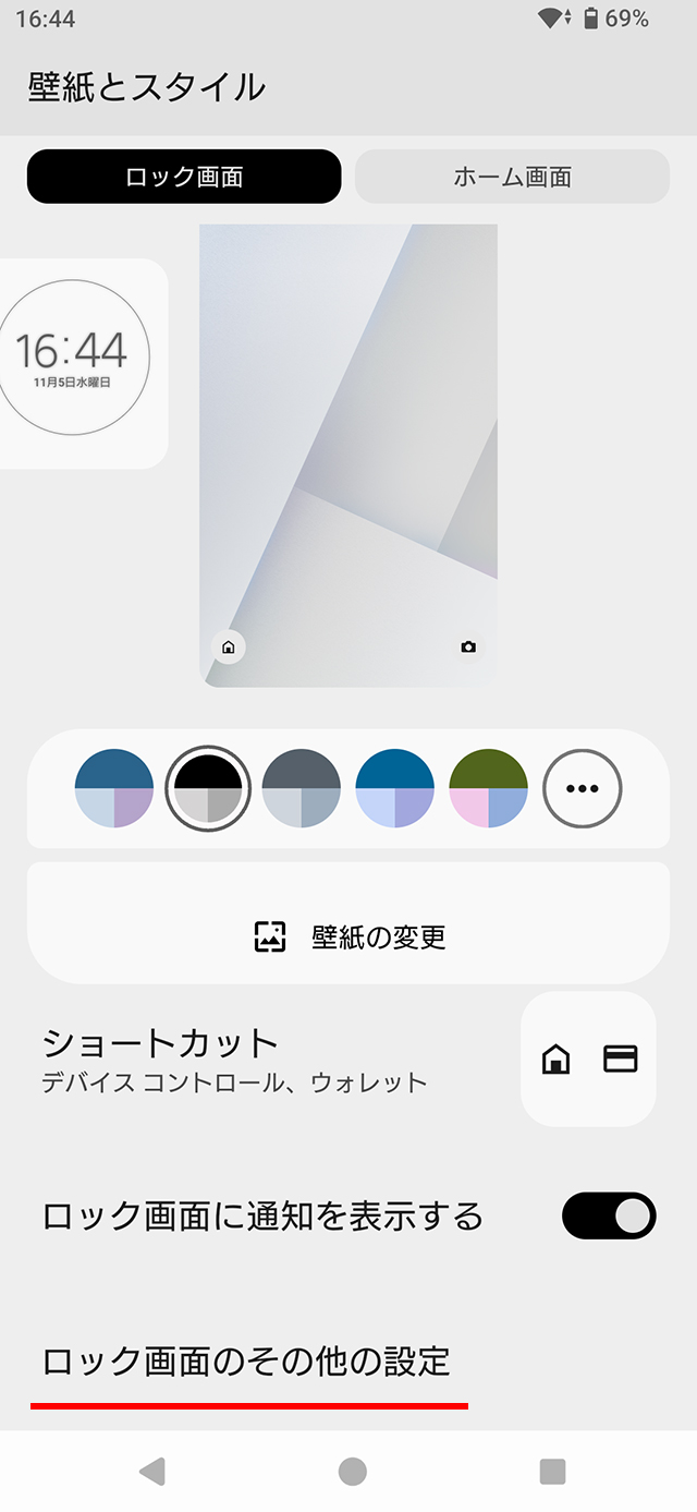 ホーム画面の何も表示されていないところを長押しして、[壁紙とスタイル] > [ロック画面] > [ロック画面のその他の設定]をタップする。