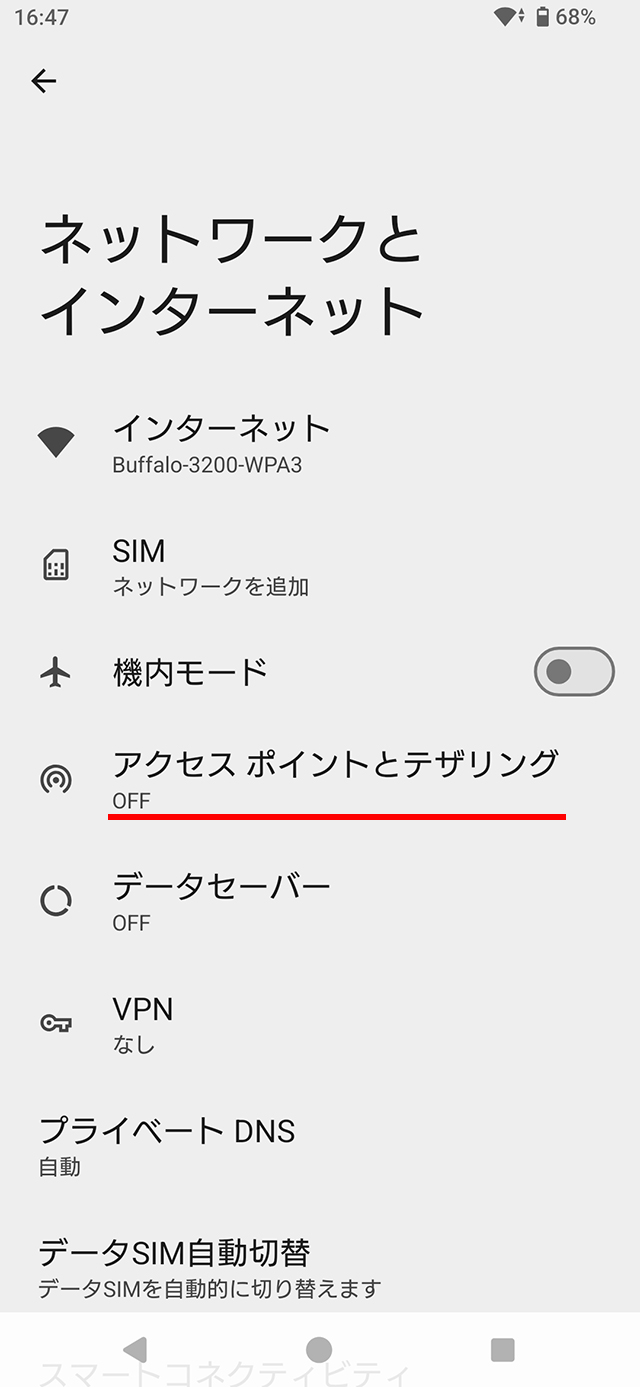 Wi-Fiアクセスポイント機能を使う場合、[設定] > [ネットワークとインターネット] > [アクセス ポイントとテザリング]をタップする。