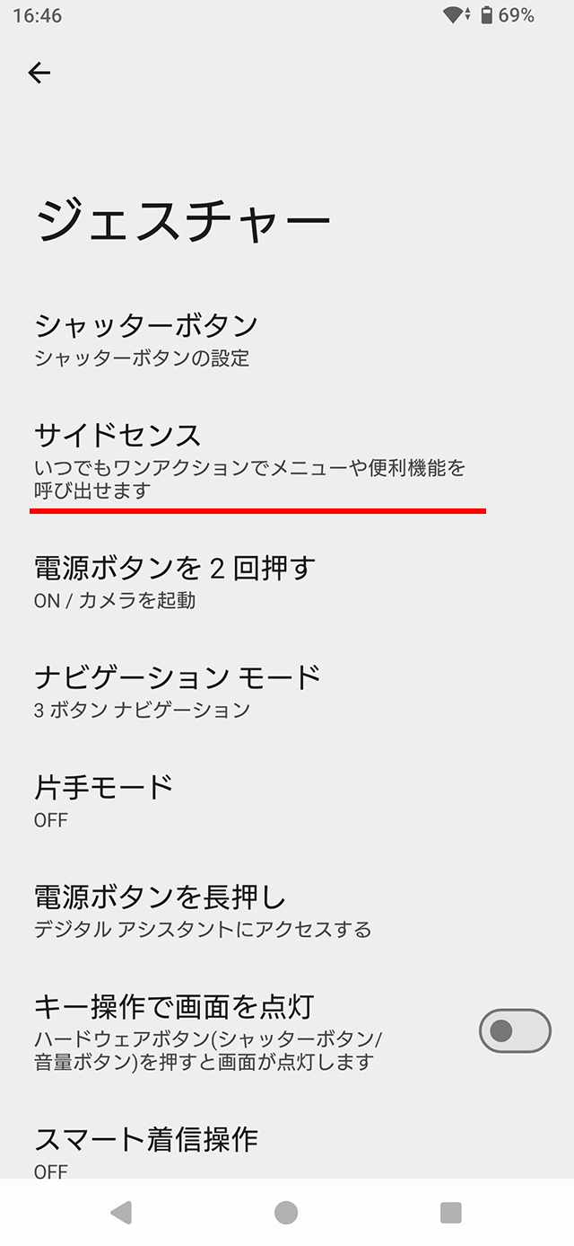 ※[設定] > [操作と表示] > [サイドセンス]の項目はなくなっている。