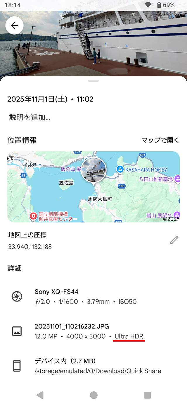 Xperia 10 VIIでその画像を開いてみると、ディスプレイにはHDR表示できないものの、データとしてはファイル形式はUltra HDRの画像であることを認識している。